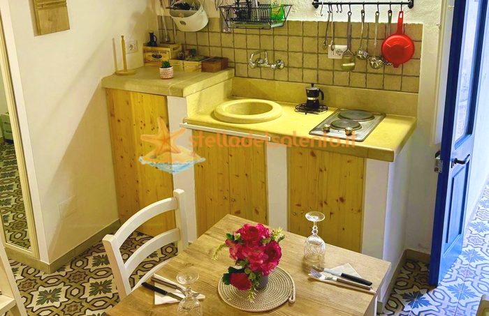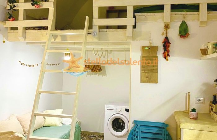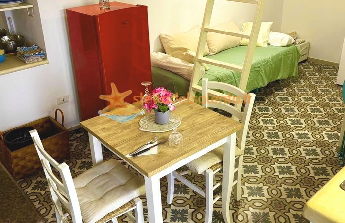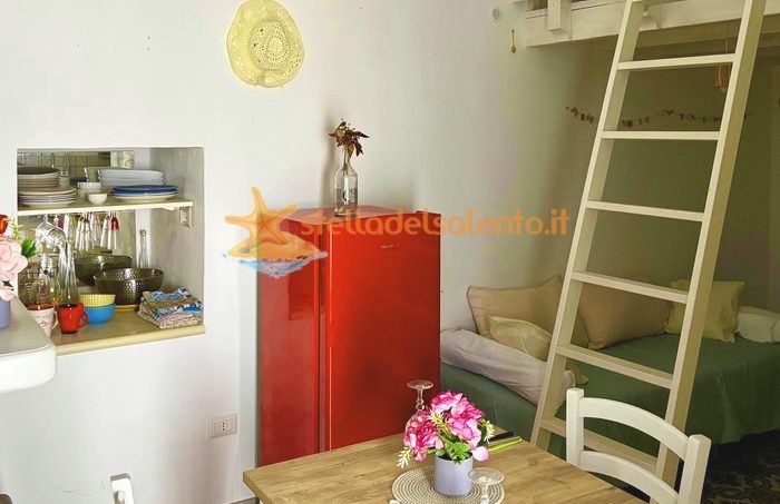 Rispettivamente composta da una cucina completa ed equipaggiata di tutto, due letti singoli in un soppalco, e nel soggiorno disponibile un altro lettino singolo per un totale di 3 posti letto. Lo spazio esterno è equipaggiato con tavolino e sedie per pranzare/cenare all’aperto.