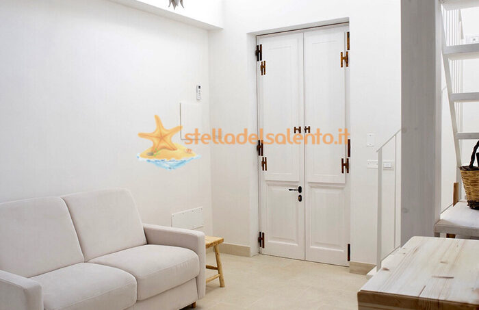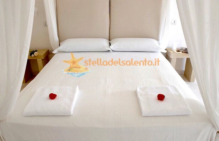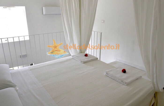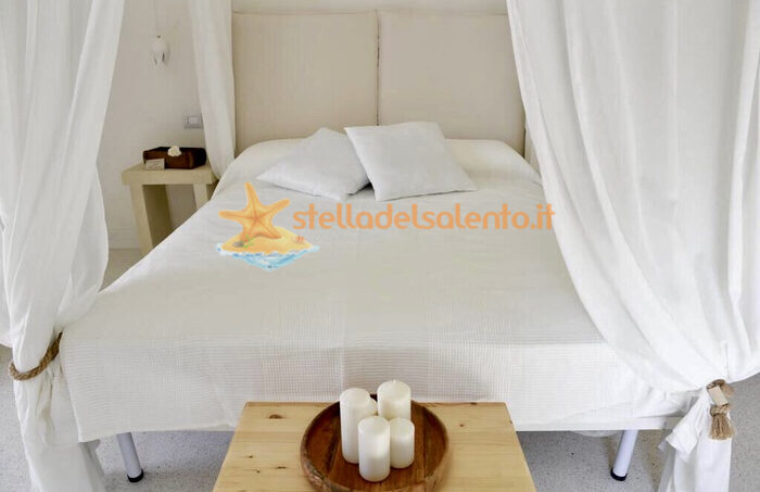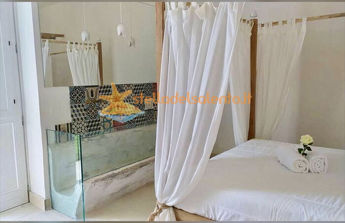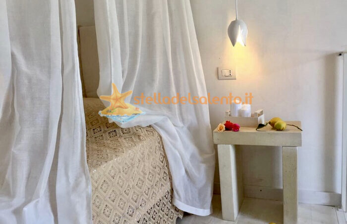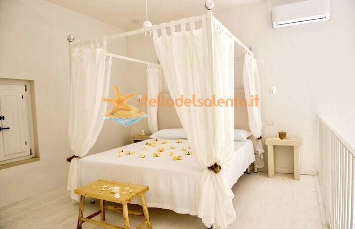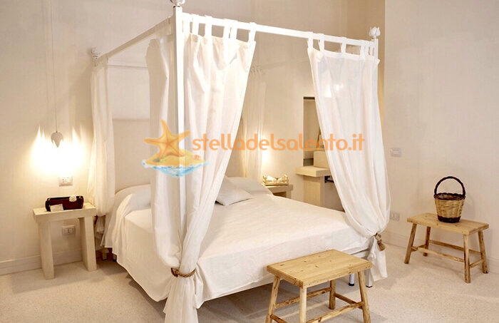 Camere con letto a baldacchino matrimoniale su soppalco in legno e comodo divano letto apiano terra, pavimento in pietra leccese, accesso indipendente e porzione di patio privata con sdraio e tavolino. Minibar, cassaforte, bagno con doccia, asciugacapelli, connessione wi-fi gratuita, tv, aria condizionata, 30 mq.