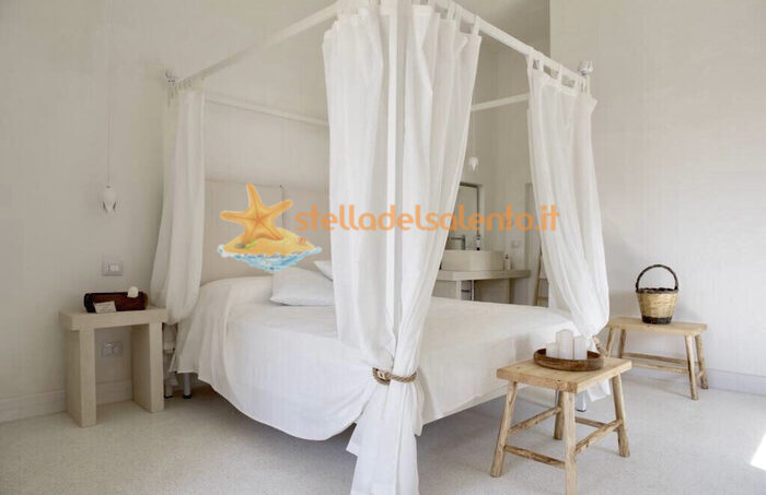 Camere di design con letto a baldacchino matrimoniale, pavimento in pietra leccese, accesso indipendente e porzione di patio privata con sdraio e tavolino. Minibar, cassaforte, bagno con doccia, asciugacapelli, connessione wi-fi gratuita, tv, aria condizionata, 25 mq.