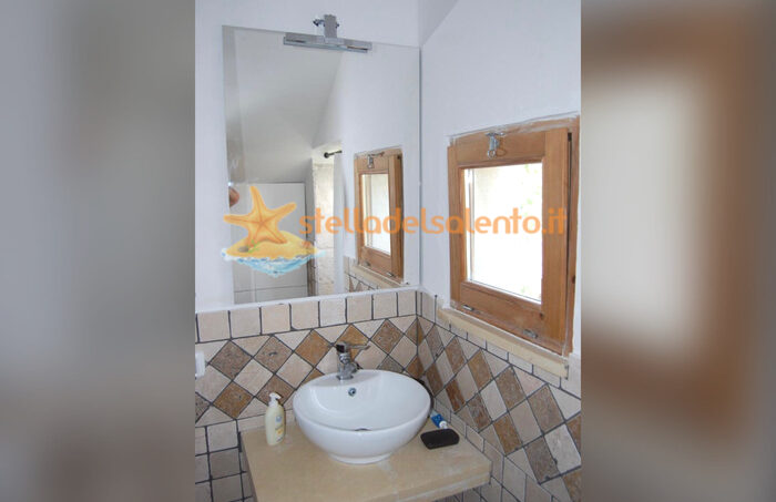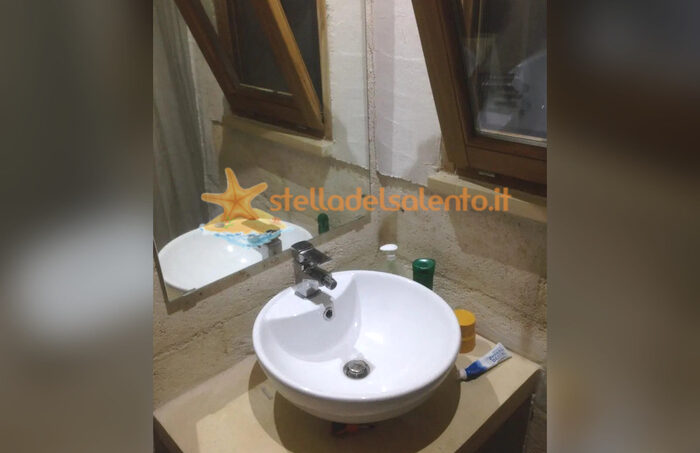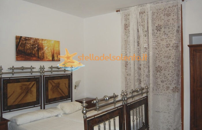 La camera matrimoniale è arredata con mobili di fine ‘800 salentino. Il bagno ha una parete in pietra leccese ed il vano doccia in pietra viva. Ha accesso indipendente attraverso il giardino ed è condizionata.